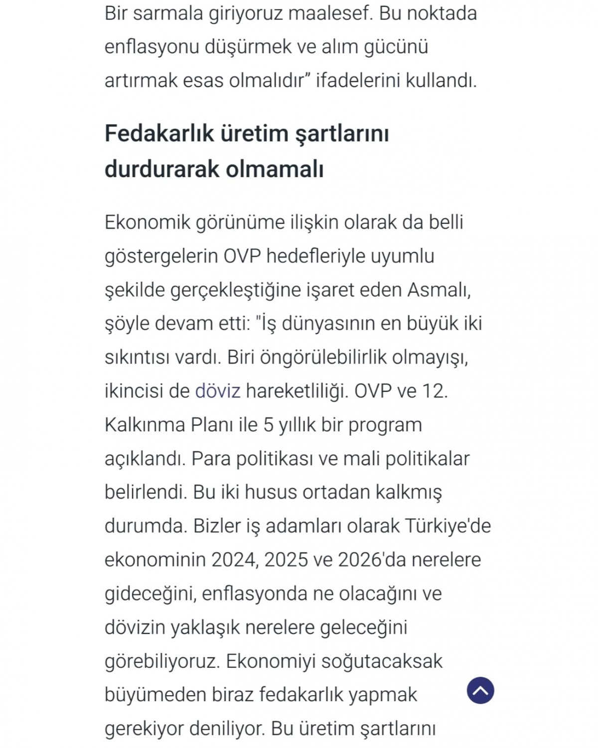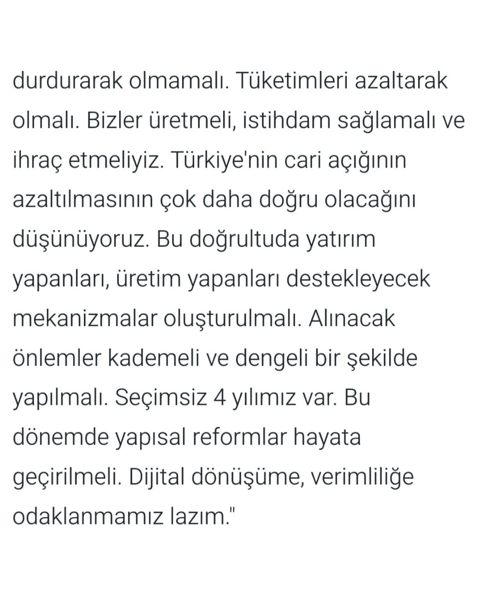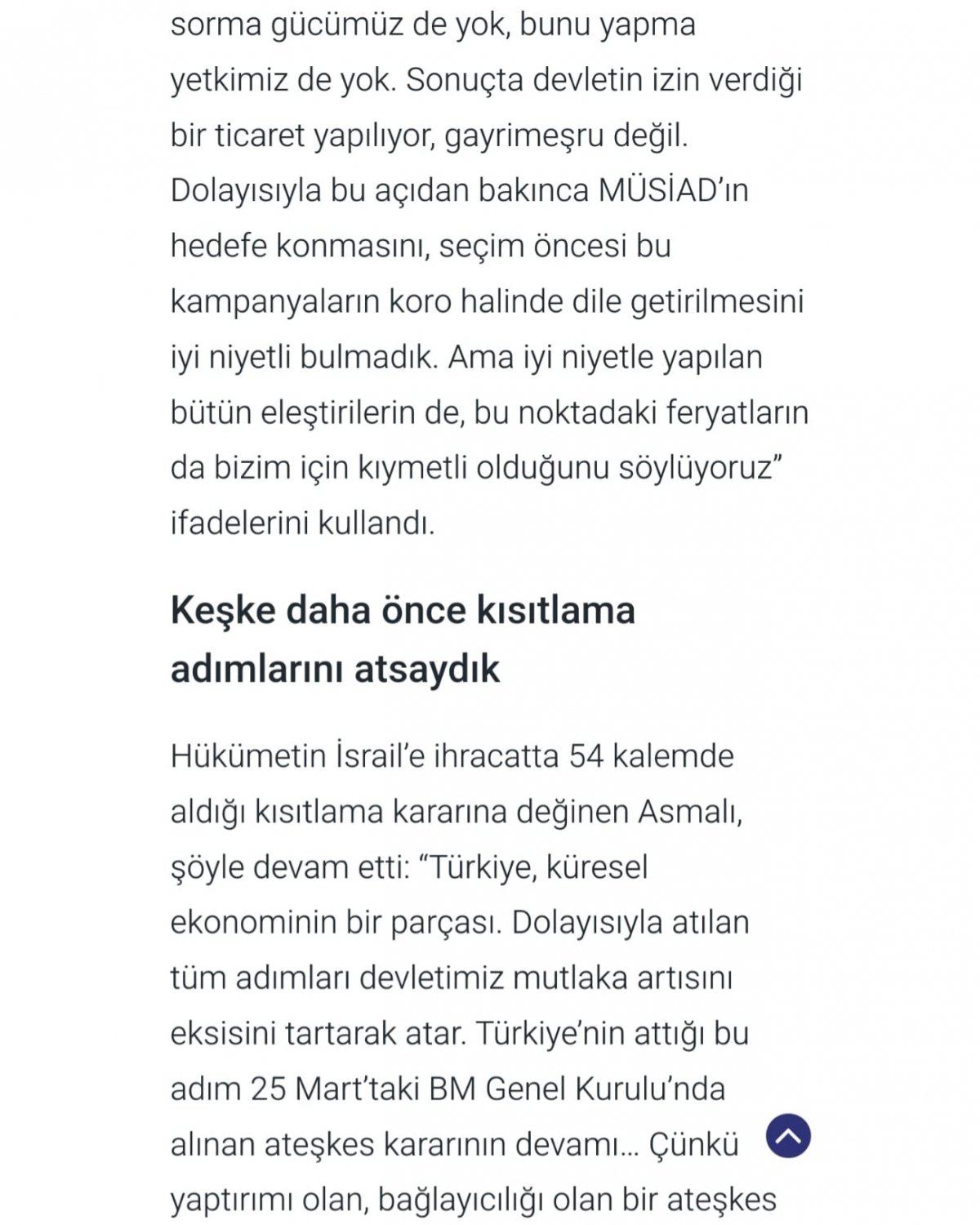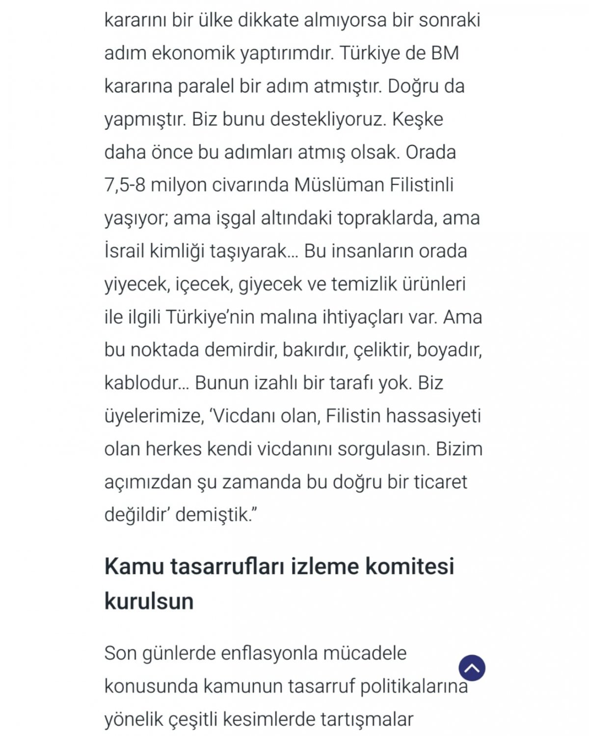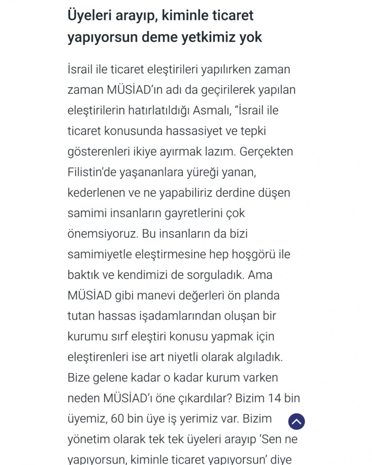 Enflasyonla mücadeleden kamu tasarruflarına, asgari ücretten İsrail ile ticaretin kısıtlanmasına kadar gündemdeki önemli konulara deÄŸinen Genel BaÅŸkanımız Mahmut ASMALI, İsrail’in Filistin’e saldırıları sonrası bazı İsrail ürünlerine yönelik vatandaÅŸların gerçekleÅŸtirdiÄŸi boykotu deÄŸerlendirdi. Filistin için yapılan boykotu önemli bulduklarını söylerken, “Onlara sattığımız ürünlerden çok, onlardan aldığımız mallarda boykot daha önemli. Ancak boykot ettiÄŸimiz ürünleri biz kendi üretimimizle raflara koyabilmeliyiz. Bunu koyamıyorsak bu da iÅŸ adamları olarak bizim ayıbımız diyoruz. Bizim mutlaka boykot edilen ürünlerin daha kaliteli ve ekonomik olanını üretmemiz gerekiyor”.